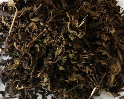 Lá có cuống, mọc đối, phiến lá mầu lục tro hoặc lục vàng, thường bị vụn nát, nhăn nheo. Lá nguyên vẹn đủ thì hình tròn trứng, dài 6,6 – 10câm, mép có răng cưa, hai mặt đều mọc nhiều lông nhung, chất mềm mà dầy. Mùi thơm, vị hơi đắng, cay .